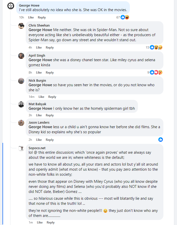 I did not blur out the names of the people here cause they left their comments on a public forum; and want others to see what they are saying, about a pretty famous actress. Especially after all 3 of these Spiderman MCU films. The dishonesty from white society on matters like these, I feel, is crazy. Cause, did they really NOT know who Steve Harvey of all black people was?  Commentary from above came from a post, about how ‘even the director’ of the films, NOR Kevin, MF, Feige had no idea who Zendaya was.