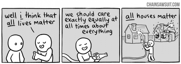 If your HOUSE is on fire; and firemen show up; only an IDIOT would say “All Houses Matter!!” – when clearly ONE house is on fire; does that mean the OTHER houses don’t matter? Of course not; but ONE is on FIRE and needs help RIGHT NOW – it needs focus; attention; etc;